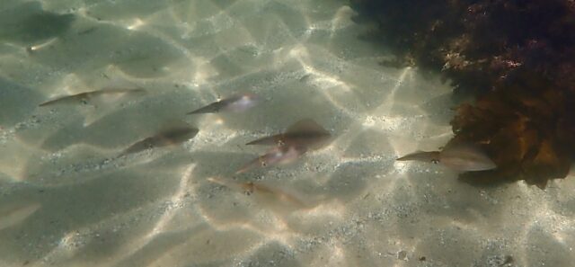 There were 10 squid in this school. Initially they lined up as if to pose. They do that but at the sight of a camera they disperse. Unkind.