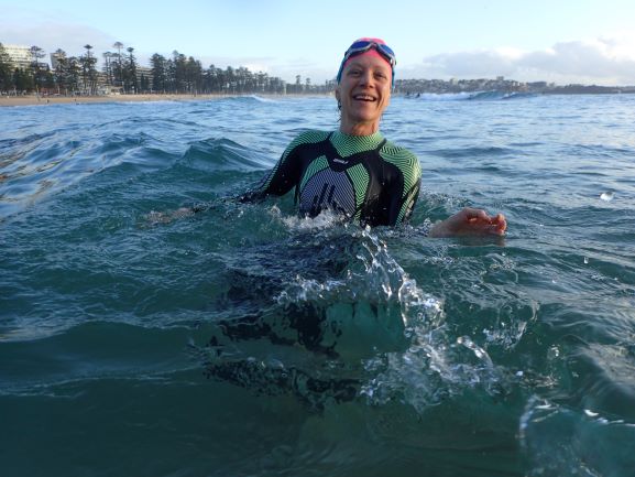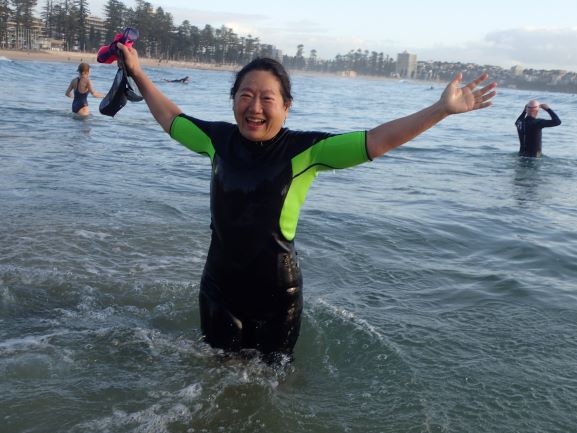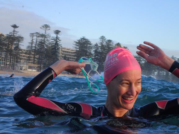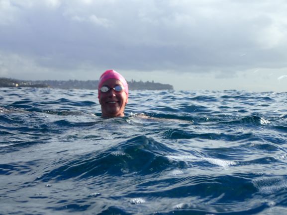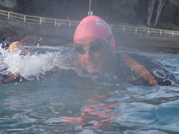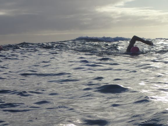 Here is Karen. She saw that I was waiting with trepidation behind the waves on my return. She asked if I was ok and waited for me to swim in. Even though it became apparent to her that I cannot swim fast and that I kept checking she swam in with me. Thank you Karen for being the very best type of ocean swimmer.