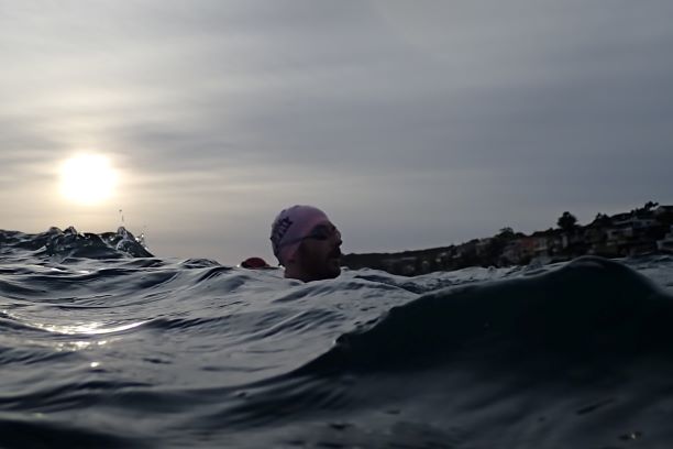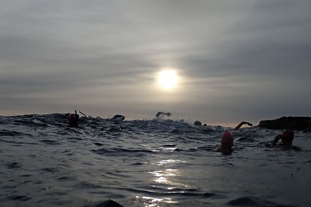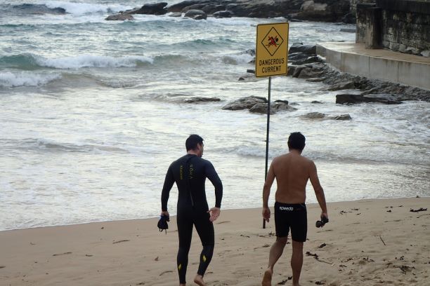 Well the sign said dangerous current today and it was a bumpy bumpy swim. There were lots of people out having their own go. I was asking about presence of blue bottles in the water – everyone I asked said no but I did get a little sting by one near the point. On every swim but especially today you should check in with your own capability and enter/exit/swim accordingly
