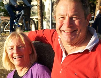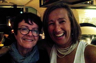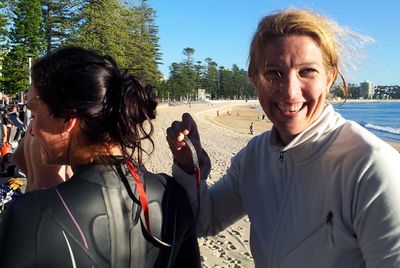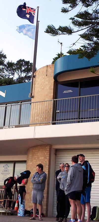 So – when do we stop wearing wetsuits? Well, I reckon it’s when you go for that warming coffee, and everyone at the cafe is wearing thongs. Here, Sabine is helping with a wetsuit. (Not really. She’s doing a hammy re-enactment of the job.)