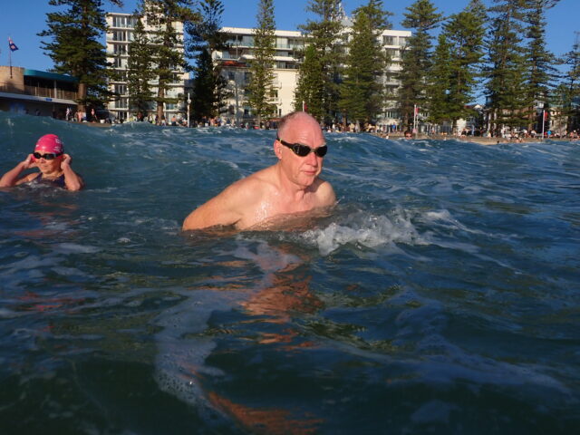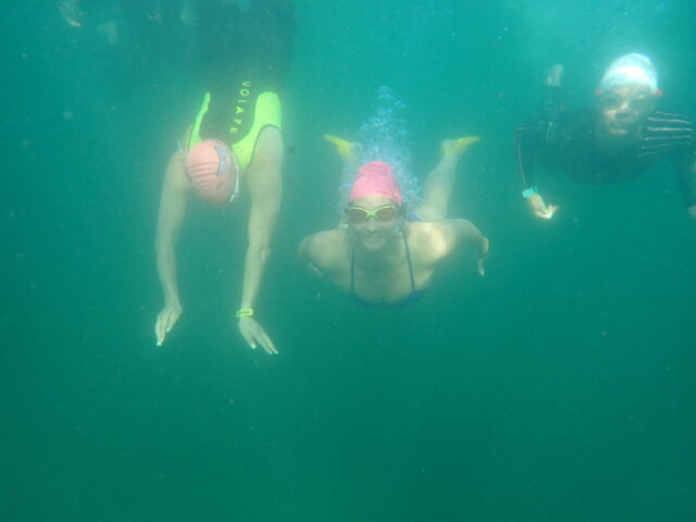A huge number went in at 630 am and even more at 7. So many options with the light in the morning. Paul is going without a swim cap. People have different coloured caps and water polo caps because everything goes.