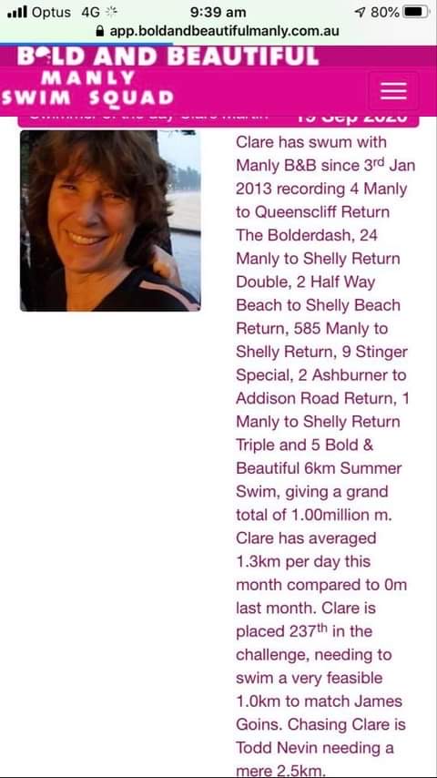 Lovely indeed. Thanks Edwina. A perfect swim, clear and uncrowded. Congratulations Clare!
