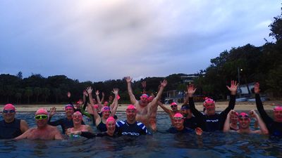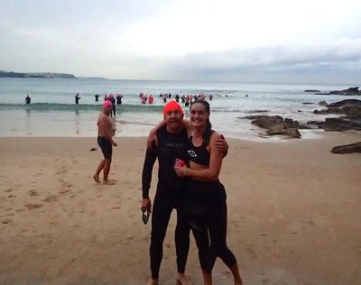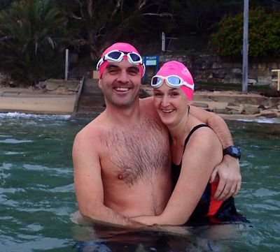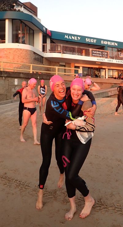 Sarah is always ecstatic after her 6.30am swim as she crosses with the 7amers. Here she hugs Ian who clocked up 1000 kms over the weekend!