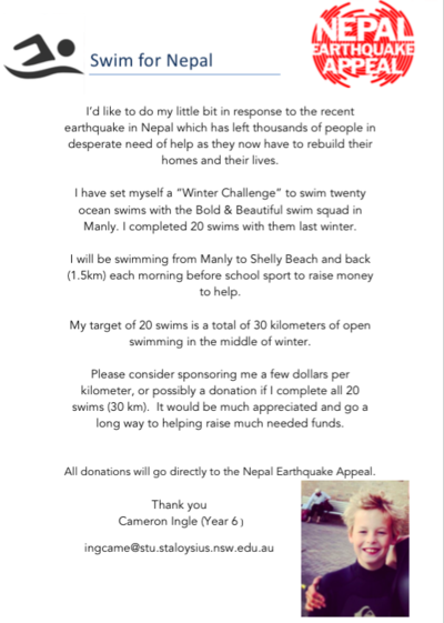 We have an amazing 12 year old swimmer Cameron who swims with his Mum Hilary and is swimming in Winter and raising money for Nepal.