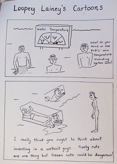 We all love Roger’s Friday blogs. His cartoons are amazing. Some of you may remember my poor attempt at ‘cartoons’ when I first started blogging 2 1/2 years ago. I thought I’d dig out one. recommending a different type of water temp indickator 😉