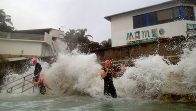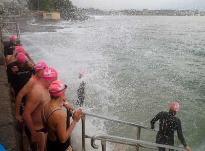 What a miserable morning it was this morning! Funnily enough though… rain, rough surf, bluebottles and news of shark attacks still didn’t put around 50 of us off from throwing ourselves in that wild and churned-up ocean today and swimming to Shelly!