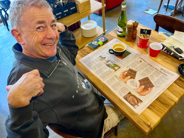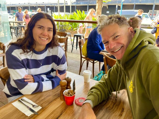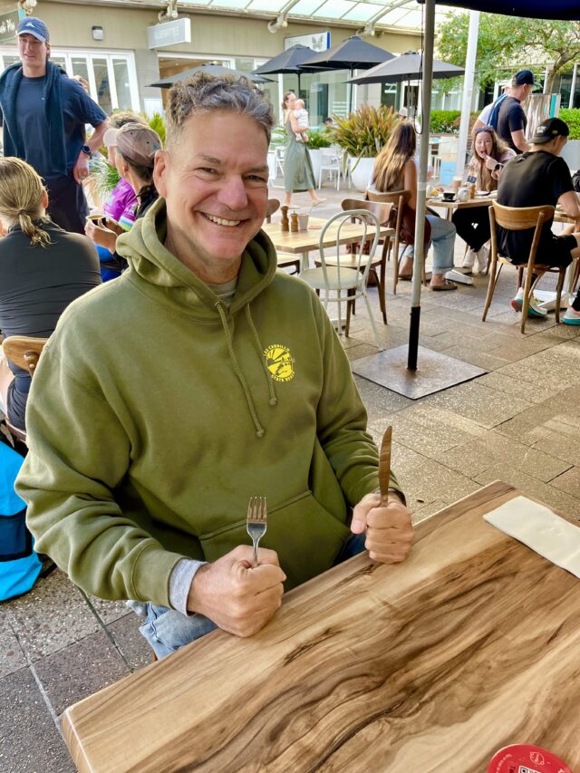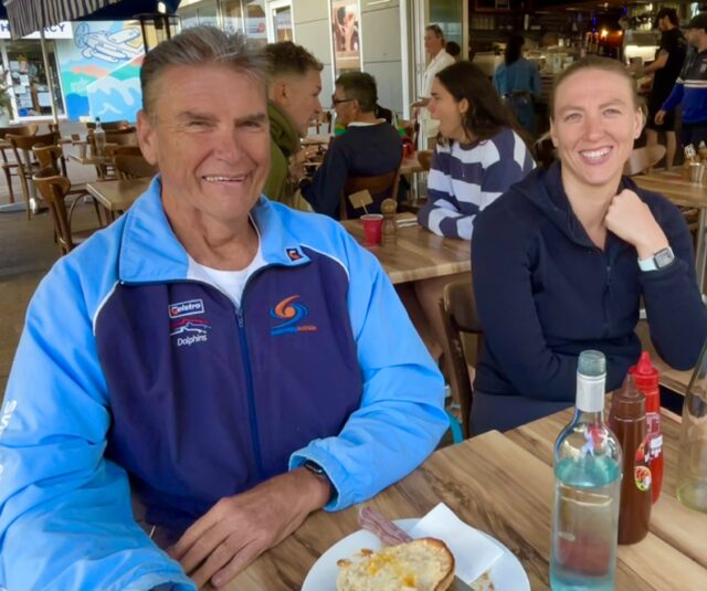 Gary (wearing his son’s “Swimming Australia” jacket) breakfasted either Kara et al.