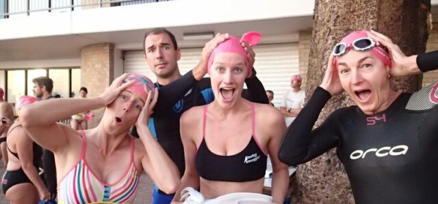 Having handed out in excess of 7000 pink caps prominently – how do we get them back? Or should we fight this silliness. After all, we swim, they act – kind of. Just because we have become popular with TV shows and other media, surely this does not mean that we operating in the same medium? Needless to say, there were many concerned swimmers today. Disbelief all round as we tried to cover up the offending words!!