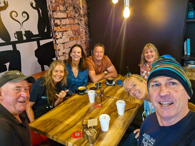 620 we can’t wait any longer. Snoopy, wave queen, and me paddle, closely followed by Brett, Ali, Trish and Jo with Kath and Di loitering further back. About 1 second later the rip has pulled us 100m past the point, way out wide.