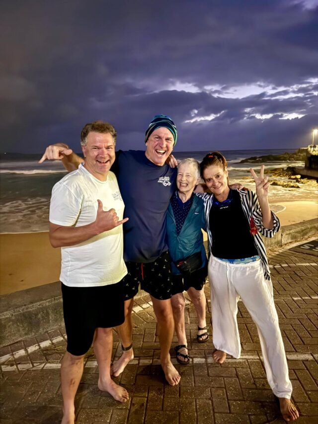 Then the grommets arrived, 100 strong. My 11th wave, going right I tangled with one. Leg rope around my throat and back and leg, rolled like a mummy, 2 meters held down under. Sophia sees me on exit and comments that I’ve been whipped. Glorious I don’t care.