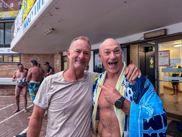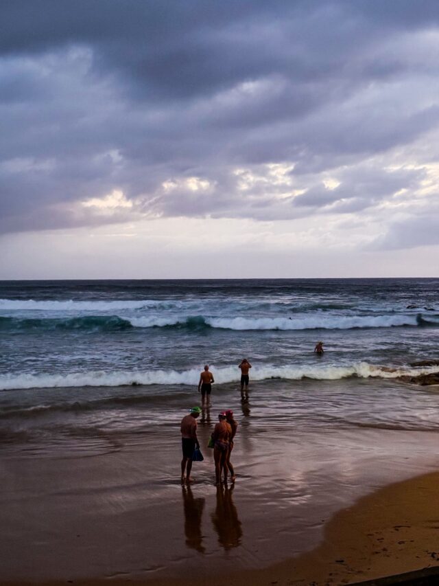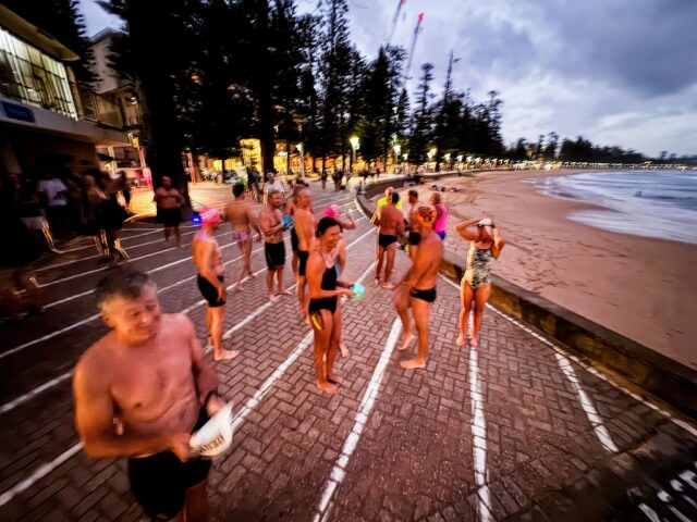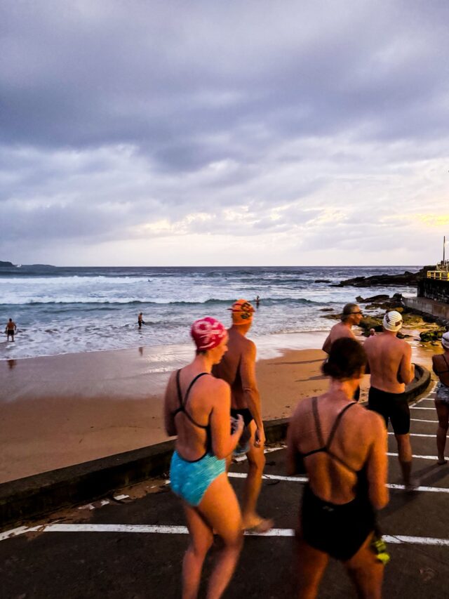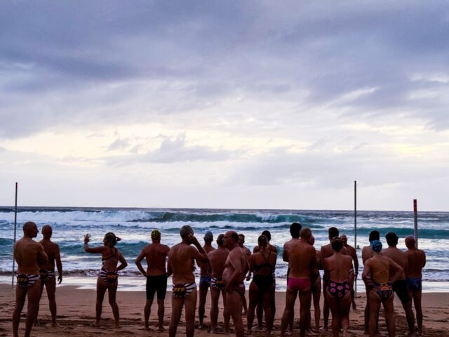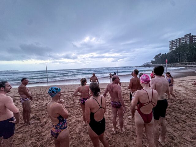 Grey skies brooding overhead, five-foot waves marching in, and plenty of chitter chatter along the wall – to swim or not to swim, that is the question 💀
