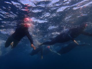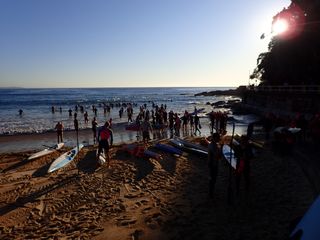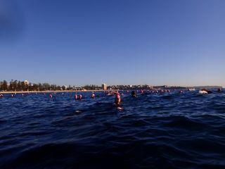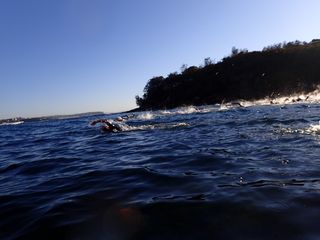 Bathed in light, 160 or so swimmers entered 19.3 degree water with smiles on their faces.  Everyone must have been really keen today because it felt like we started half way across the bay!  A comment heard post swim likened the experience to being in a hammock.  The rolling waves gently rocked us to our happy state.  Hoorah for the weekend!