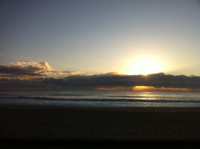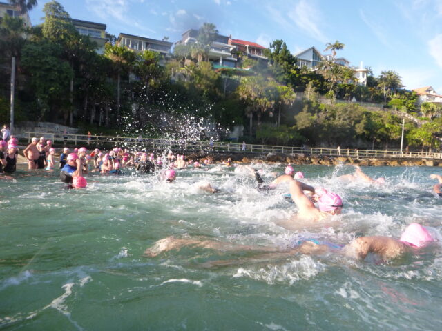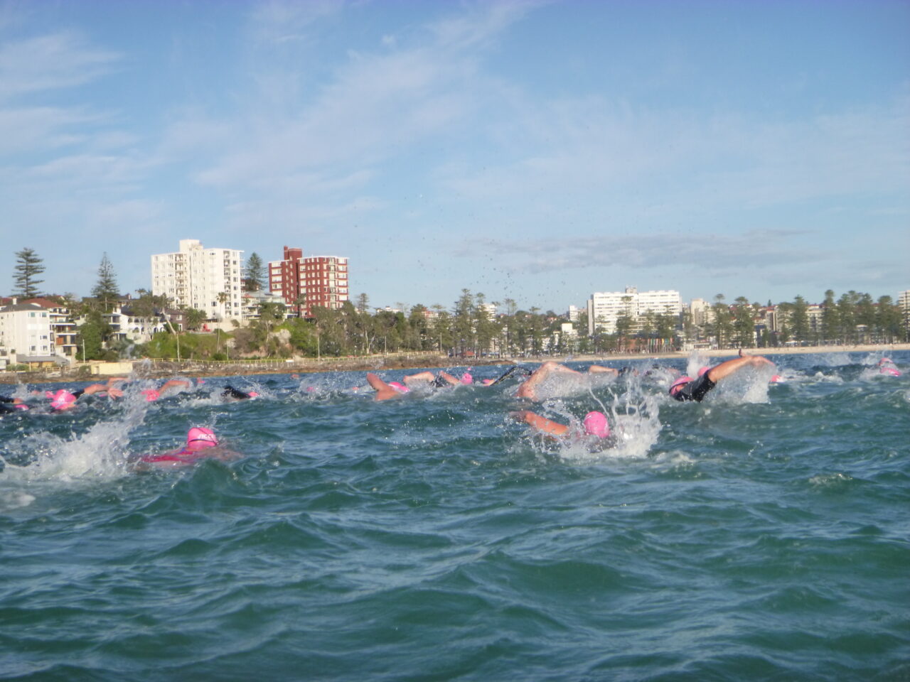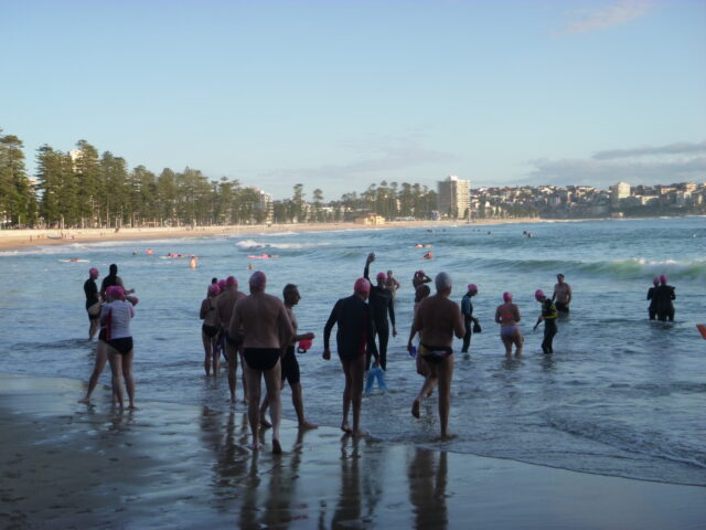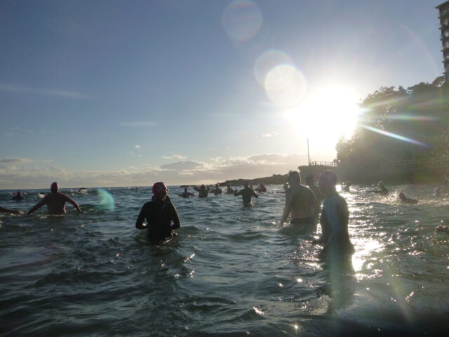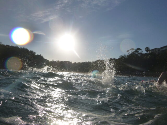 Rays of light beamed skyward out of a bank of low-lying clouds.  Orange, peach and pink hues spread beneath, emptying into the swell on the horizon. Soon the sun peeked its head over the silver lining and bathed us as completely as our immersion in the salty slosh. The sandy sediment of the shore churned as if stumbling and was held suspended in our pathway to The Point. The odd piece of seaweed was scooped up with outstretched hands and left in the wake of streamlined bodies. The swell increased as we swam into Shelley with a slick splash of speeding legs and a spattering of arms…
