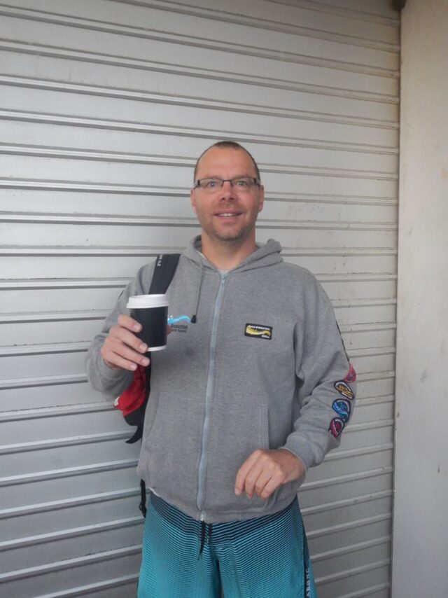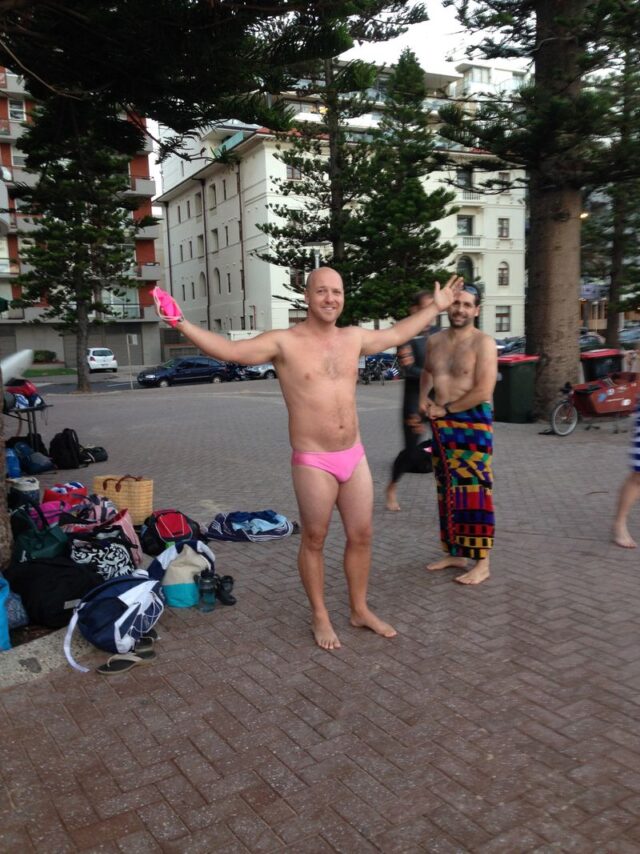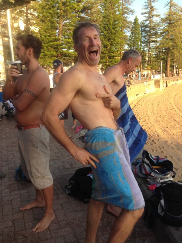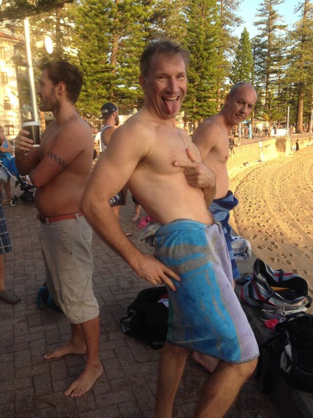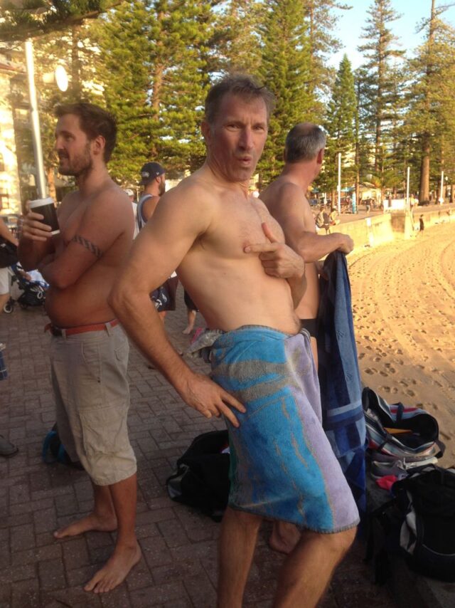 Last in First out…..Tim explaining how much he beats Sterling by (7 inches apparently) despite the faded pants and being the last man standing on esplanade.