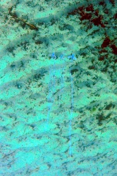 Those blue things are actually little fish. They are juvenile Pennant Fish also known as Threadfin Trevally. They may also be juvenile Diamond Trevally. I have seen them in Sugerloaf Bay in Middle Harbour. At first I thought they were some form of jellyfish….