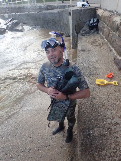 I was reading a list of Shark “don’t s” during the week. Number 1 was don’t spearfish in camouflage, and number 2 was don’t swim with pets. So, you can imagine my horror when I happened upon Mark at the Bower this morning: