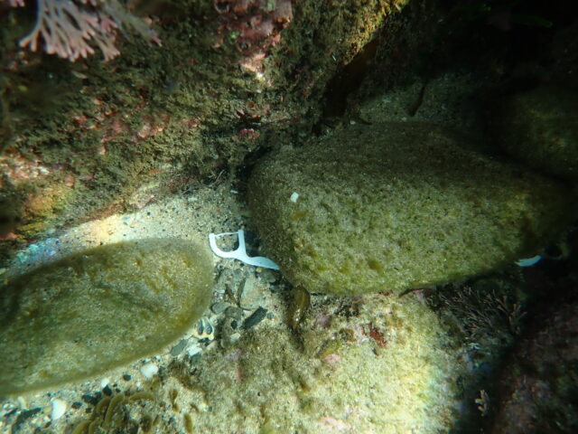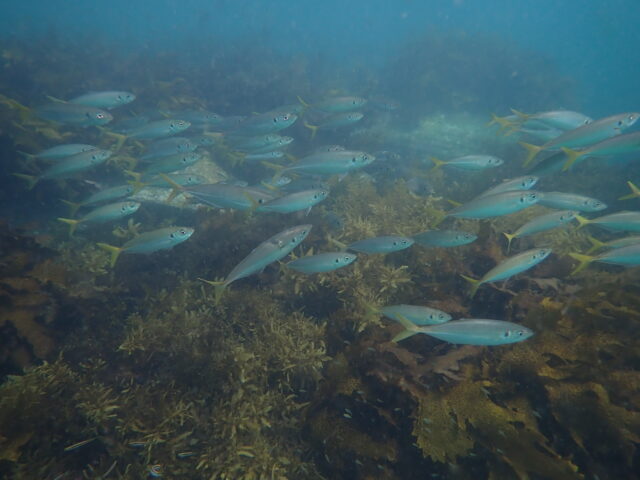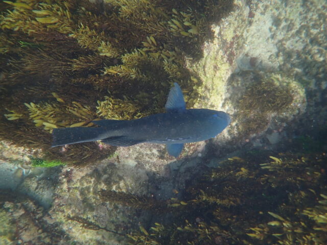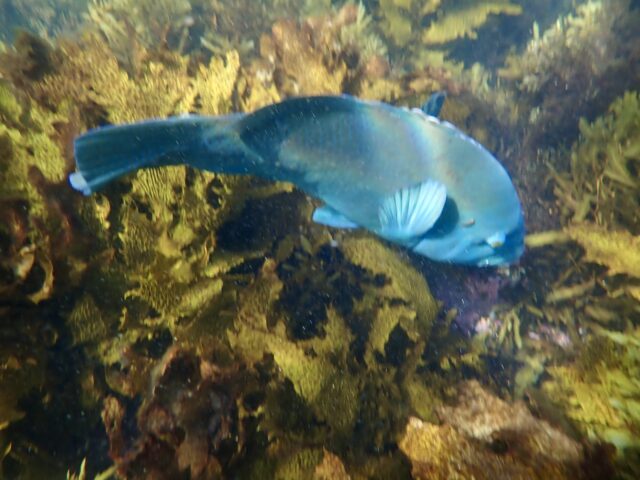 Meanwhile, this is definitely Gary the Groper at the Point, evidenced by the split fin. He seemed to be feeling a bit frisky today, chasing a comely female, far away from his regular haunt of the boulders. I was no competition for that silver spunkrat and he had no patience for me. He’s a big boy (well not a boy – at least 30 years old, some say closer to 50) and I can’t imagine that he’d have much competition from other males.Size, longevity and good looks count for much in the Groperverse.