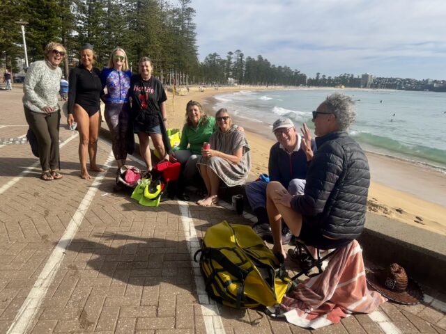 These wows and womwmen enjoying pre/post swim sunshine, in progressively fewer layers of clothing. Not a puffer jacket to be seen apart from on Mr Dennett who is not blessed with subcutateous insulation. Some had to be dragged into the photo while others sprinted to be included.