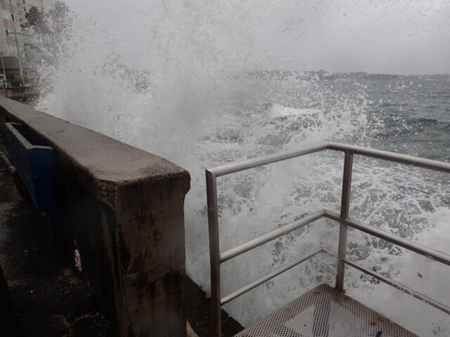 If you try to look on the bright side, usually you are swimming in to glare. Not today. The swim had a bit of everything: Rips, waves, current, some jimbles, seaweed, some black spiky urchin things wrenched from the rocks floating about. Huge high rise splashes against the wall t half way.