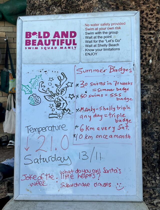 Today was a beautiful day for a swim despite some waves and surge in the bay. Temperature was 21 degrees.