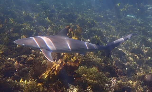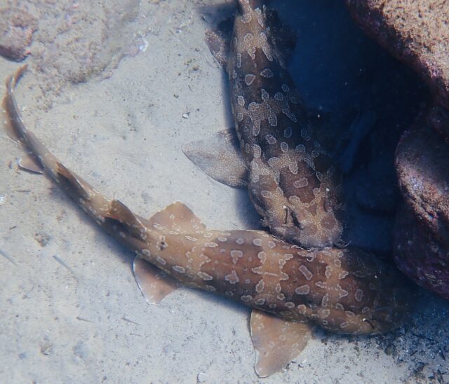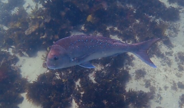 Eagle Rays, Wobbegong ( two together cosying up), Old Wives, Snapper… We followed a Dusky in close to the rocks near Shelly.