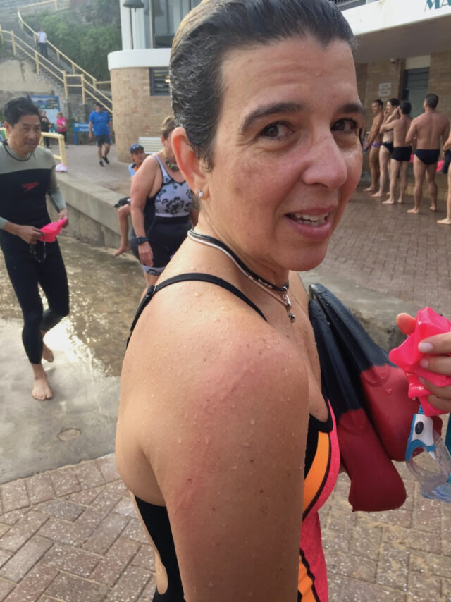 Returning 6:30am swimmer Karel was the first indication that the blueys were lurking. He was rubbing an arm on exit!