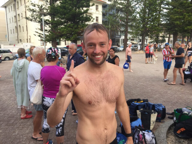 I want to say a big thank you to Michael in the red rashie. Only met him this morning as getting in the water and he swam the whole way with me and then was my hero when he unwrapped the bluey from my arm!