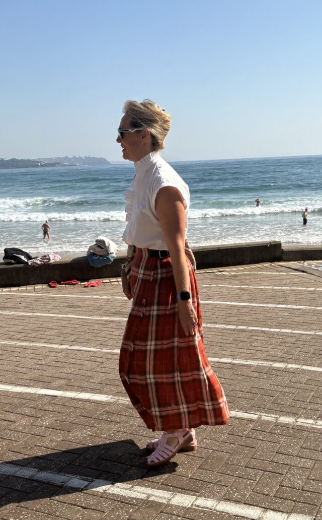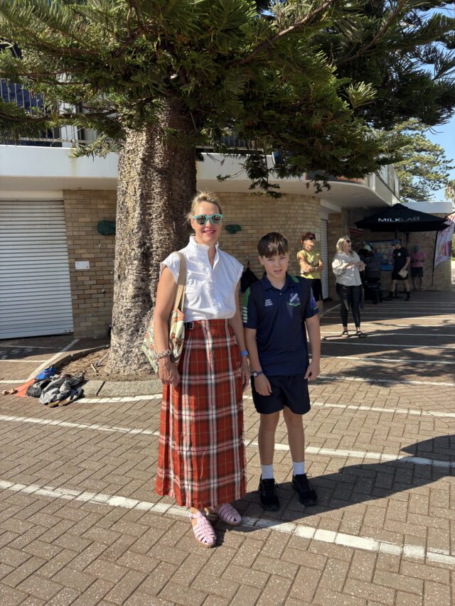 Victoria looking absolutely beautiful as she walked with her son to presentation day at Manly Village.