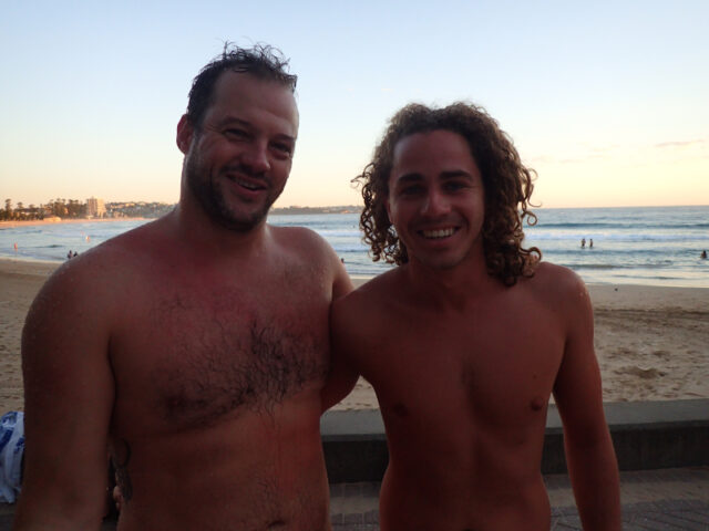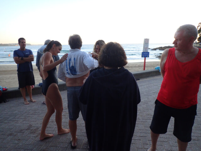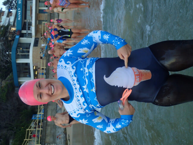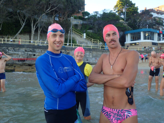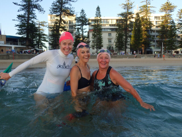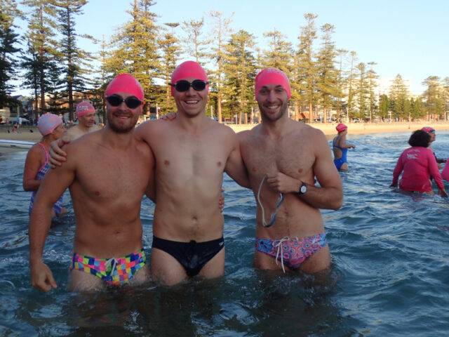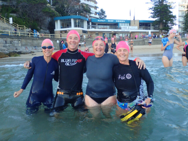 His group is growing and this morning Sam (far right) pulled on his Babewatch branded swimmers for his first Manly – Shelly with the group.