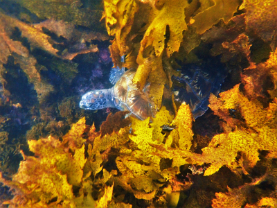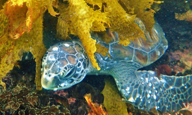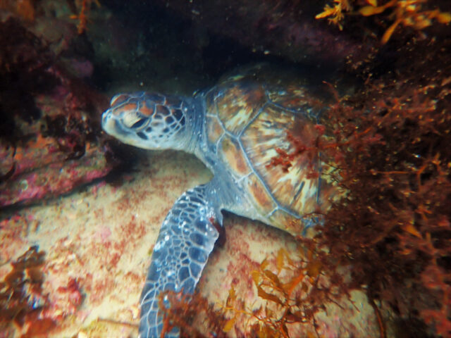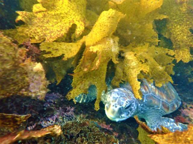 I patiently waited, knowing the turtle would swim at any minute, and after 10 min it did! As it started to come out of the seaweed I turned on my camera and…NO BATTERIES!